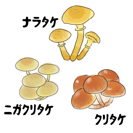 ナラタケは細分化するとたくさんの種類があるので、傘が黄色い『キツブナラタケ』やツバの無い『ナラタケモドキ』などはニガクリタケと間違えやすいかもしれません。