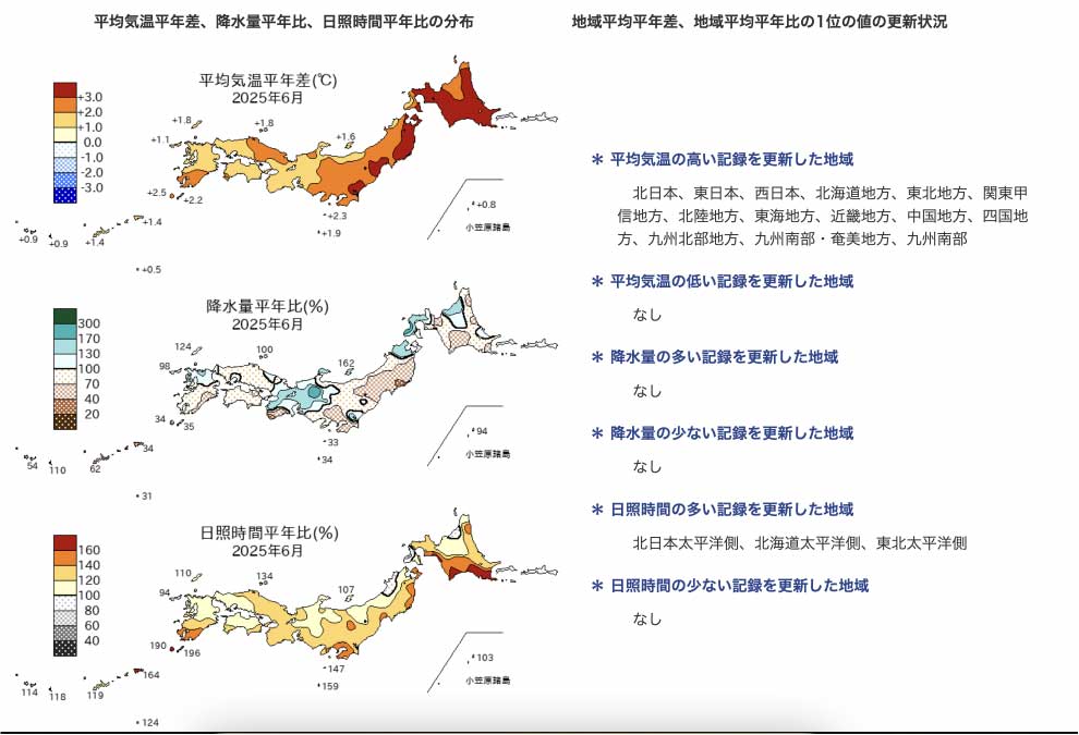 - 7月:日本全国で7月の最高気温の平均が1991–2020年比で+2.9℃、3年連続の記録更新。